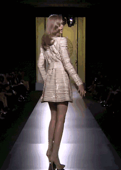 转体是模特的基本动形素,是两种表演方向的中间及节奏的转换点。无论什么转法,必须先转身再转头,体动时把头留给观众,俗称“看点”或“留头”。这样,不仅与观众直接交流时间长了,也形成了动作的不同层次感。