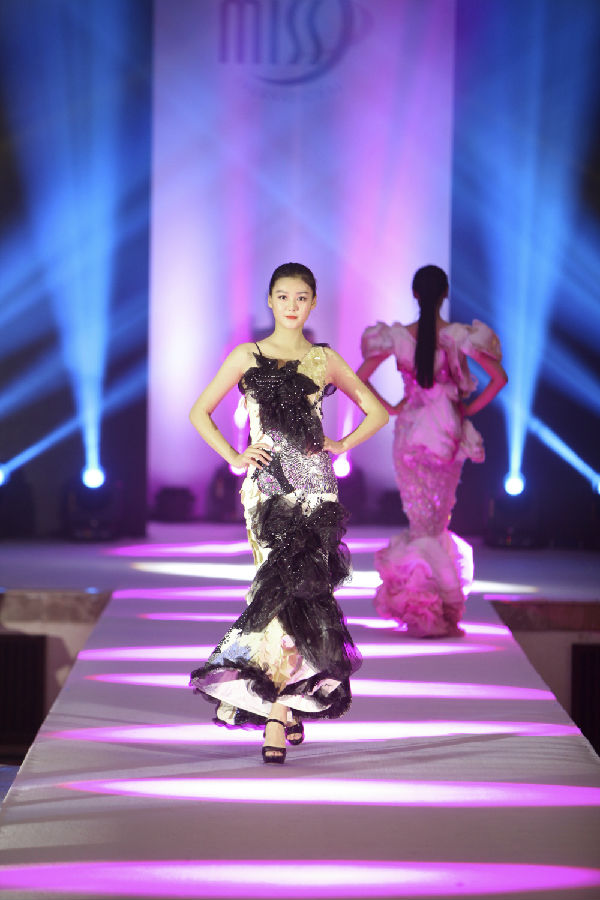 晚装给人以庄重和大气的视觉感,灯光绚丽、色彩饱和,音乐节奏属于慢拍,所以在表演上要给予唯美、时尚的感觉,走台过程中动作不易过多,幅度也不易太大,所有过程要放慢,给人一种泰然自若的感觉。