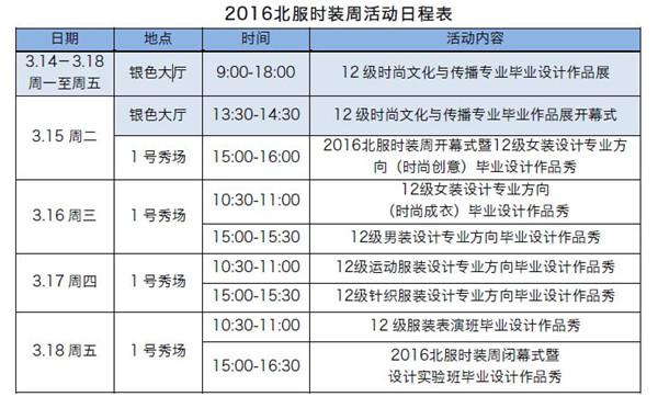 请关注服装艺术与工程学院微信、微博平台,北服时装周新浪微博平台,可获取2016北服时装周最新信息。《2016 北服时装周每日快讯》在3 月15 日至18 日每日更新并于每场动态秀现场即时发放,为各界嘉宾全面推介本届北服时装周各项活动以及各专业方向毕业生作品信息,敬请关注。