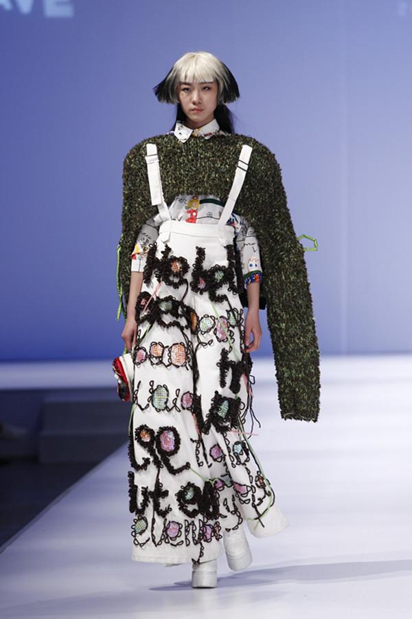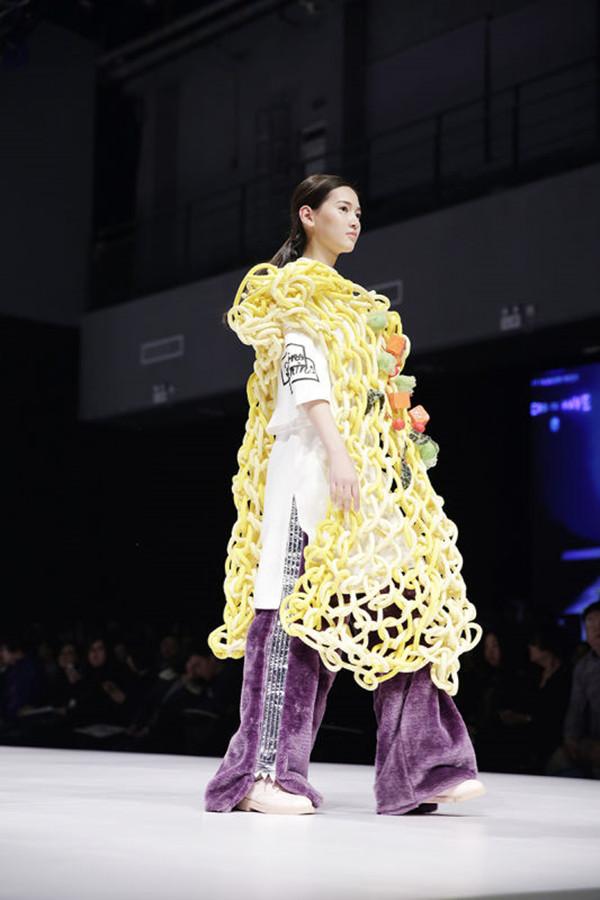 时尚创意组毕业设计作为本届北服时装周的开幕秀于3 月15 日下午3 点率先登场,这场极尽创意风格的女装大秀备受瞩目,可谓是热力爆棚、一票难求,现场评委由院校教师、跨界艺术家,时尚媒体人士共同组成,169 套作品可谓是充分而极致地传达了北服女装设计的前卫意识和实验态度,整体水准非常高,反响极为热烈。创意组的学生设计师大都希望毕业后做独立设计师品牌,或是申请国外著名的时装院校继续深造,他们主张个人设计概念的呈现,更倾向于将自己的生活经历、设计思考和文化态度放到作品中。而导师在指导也持开放姿态,不拘风格积极鼓励他们进行各种实验性材料、造型和色彩的尝试。这是未来将站在创意产业“浪尖”上 的一批人,也将是推动时装产业可持续发展的新生力量。