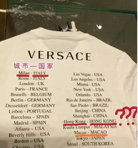 开始,一款Versace范思哲T恤中印有多个城市和国家名称,其中北京和上海后面都显示中国,独独香港和澳门背后,并未在加上中国字样,搞事情?