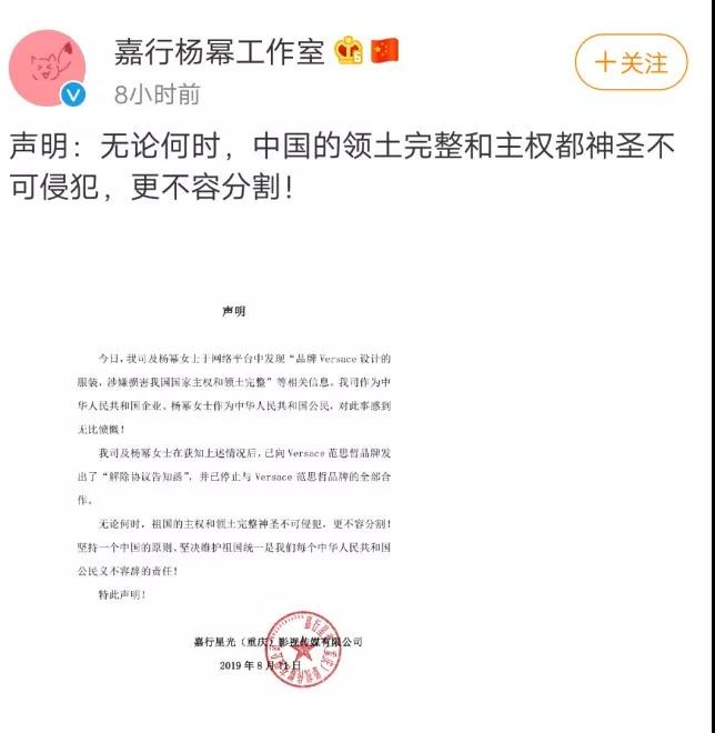 更刚的是作为中国代言人的杨幂,凌晨前Versace范思哲被曝光,凌晨两点她就解除和范思哲所有合作,又飒又刚!