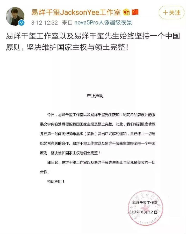 随后,Gienchy纪梵希也被网友发现“犯了同一个错误”,作为该品牌美妆代言人的易烊千玺也第一时间宣布解约。