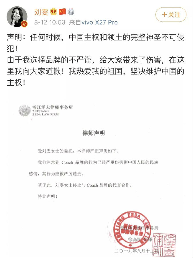 最令人意外的是,7月刚成为该品牌全球代言人的刘雯干脆甩律师函,并真挚道歉: