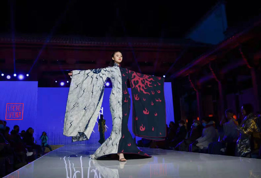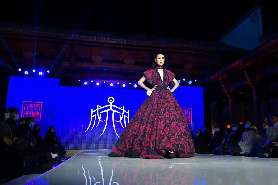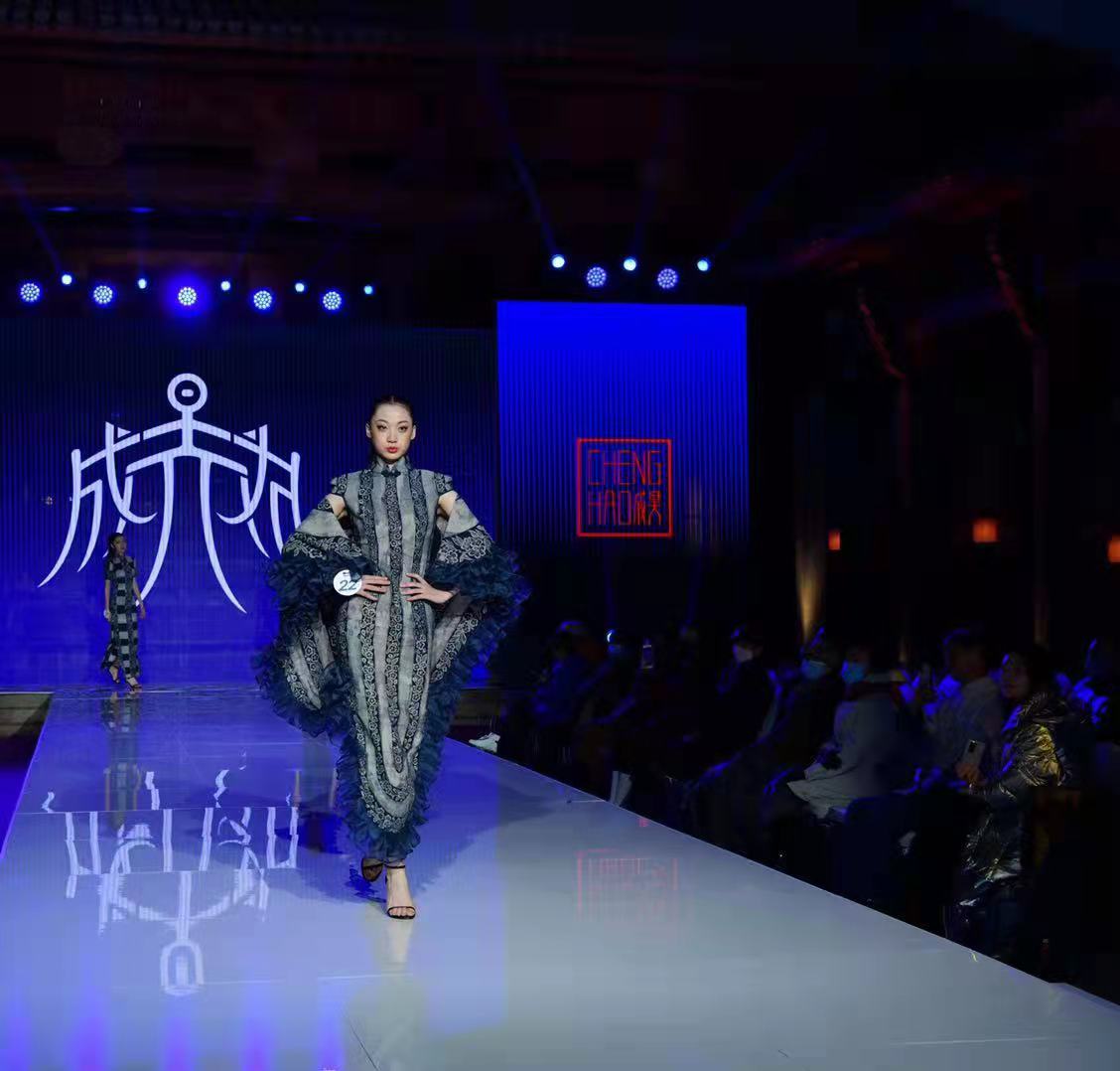 最后是中国蜡染华服系列,传统苗族蜡染工艺和图腾纹样结合,既具高级感,又有文化内涵。每件衣服所凸显的都是模特身材上的优势。