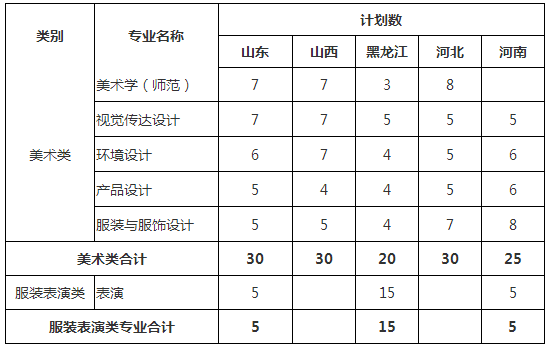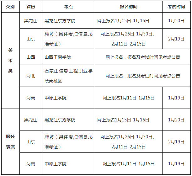 (2)黑龙江省:美术类(校考)专业只招文科考生,表演(校考)专业文理兼招;山东省:美术类(校考)专业只招文科考生,表演(校考)专业文理兼招;山西省:美术类(校考)专业文理兼招;河北省:美术类(校考)专业文理兼招。河南省:美术类(校考)专业、表演(校考)专业文理兼招。各省参加校考的考生只有在所在省指定地点参加考试的成绩有效,对在其他考点参加考试的成绩不予承认;