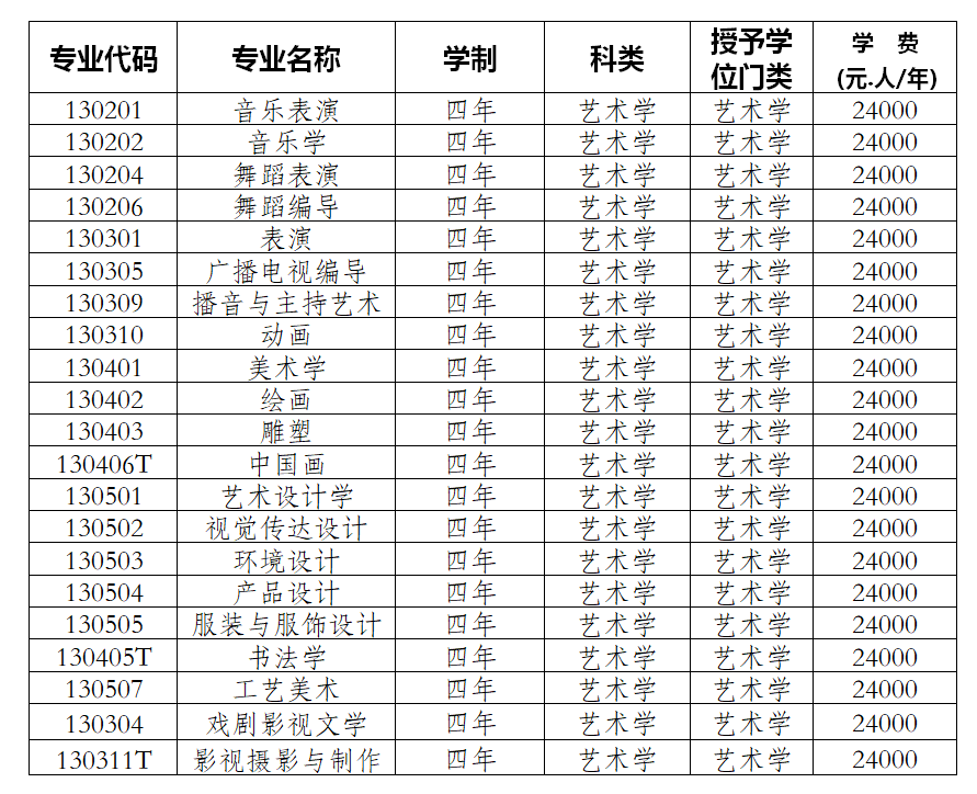 本科艺术类学生24000元/年。住宿费1200元/年。