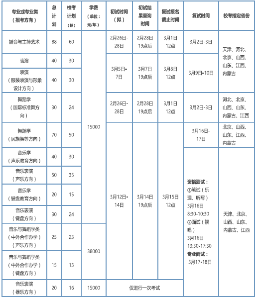 (1)音乐表演(器乐方向)专业200元/人;其他专业初试150元/人,复试200元/人。