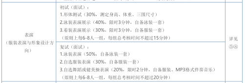 ⑤参加表演(服装表演与形象设计方向)专业初试和复试的考生可着淡妆,长发考生梳马尾辫,短发考生发型需展现整个脸部轮廓,不可佩戴美瞳。泳装环节女生应选择比基尼款式泳装,并且泳装上不允许出现培训机构标示。考生不可佩戴各类饰品,高跟鞋鞋跟不可超过10 CM。
