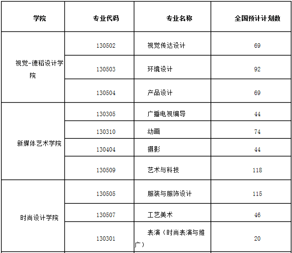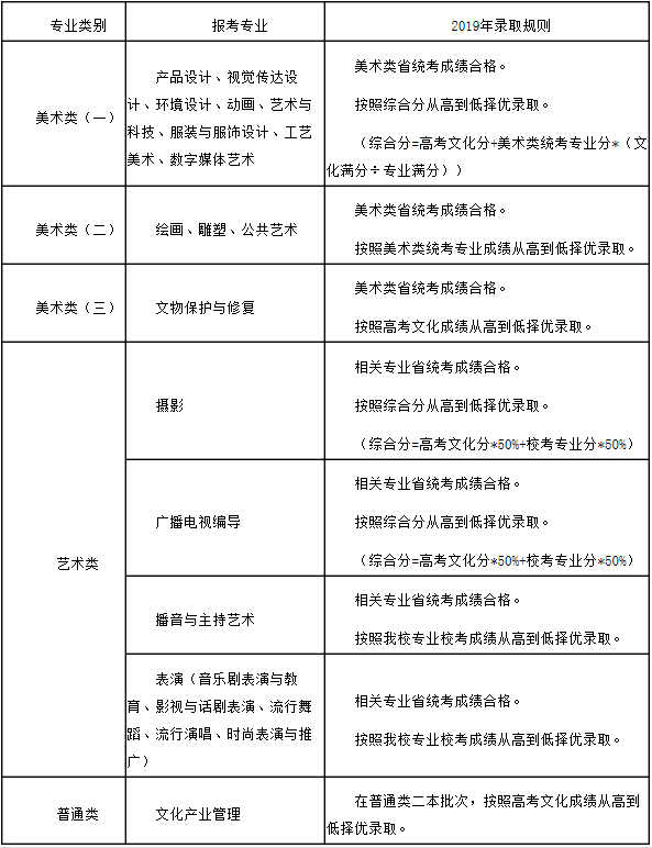 2019年,我校共有视觉传达设计、产品设计、环境设计、艺术与科技、数字媒体艺术、动画、摄影、广播电视编导、播音与主持艺术、工艺美术、服装与服饰设计、雕塑、绘画、公共艺术、表演、文物保护与修复和文化产业管理等共17个专业,总计招生1100名(以教育主管部门批文为准)。