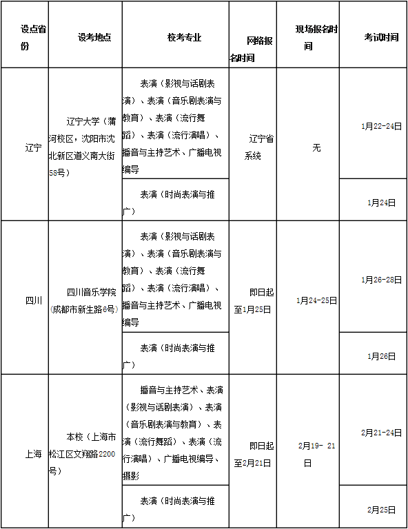 凡报考我校各招生专业的考生,须参加当地省级招生部门组织的高等学校招生文化课统一考试。我校不组织校考的相关艺术类专业,录取时专业成绩以省级专业统考成绩为依据。我校组织校考的相关专业,考生须符合所属生源省份的校考报名要求。各专业招生省市及专业考试类型见下表: