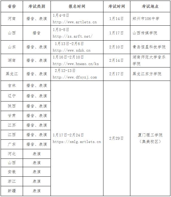 2020年我校在河南、山西(仅播音)、山东、湖南、黑龙江等五个外省设立校考考点,考点设在所在省考试院指定考点。其他相关省份的考生需到我校集美校区考点参加专业校考。