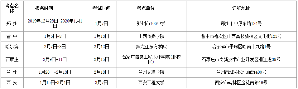 1.我校2020年在郑州、晋中、哈尔滨、石家庄、兰州、西安等6个城市设置表演(服装设计与表演方向)专业报名考试点。各考点报名考试时间和地点如下: