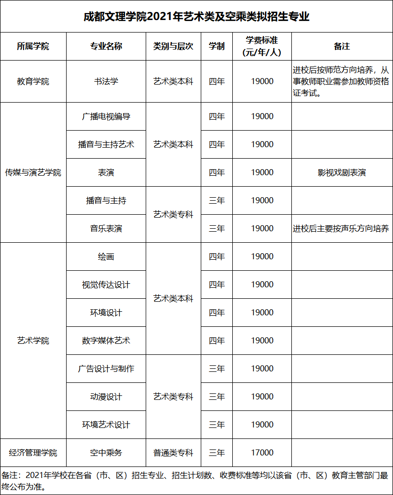 二、2021年艺术类及空乘类拟招生专业