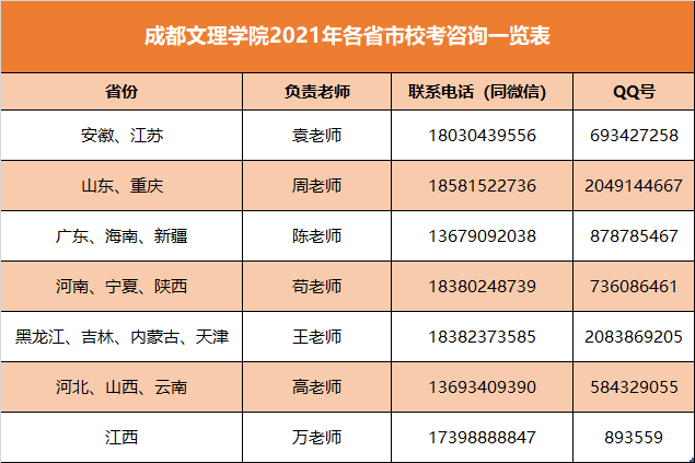 2.2021年我校在部分省份会设置艺术类、空乘类专业考点,相关省份艺术类、空乘类专业考生报考我校艺术类及空乘类专业,须参加我校组织的报名及考试。具体设点省份及相关情况将在我校招生网(http://zs.scnucas.com)及“成都文理学院招生处”微信公众号公布。