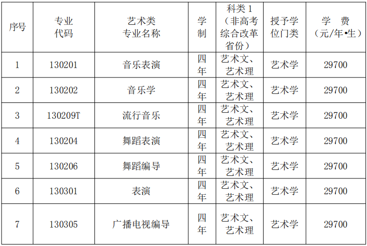 1.学费、住宿费收取标准:本科艺术类学生 29700 元/年?生。高职专科(艺术类专业) 27000 元/年?生。住宿费 3000 元/年-8900 元/年可选。