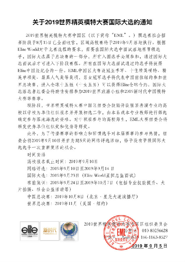 2019世界精英模特大赛中国区(以下简称“EML”。)预选赛社会招募阶段于8月15日已全面收官,区域高校赛将于2019年9月落地执行。根据Elite World对于比赛流程的要求,需要在国际大选中面试落地赛晋级选手,国际大选属于总决赛的一部分,所有入围选手必须参加,通过国际大选面试后才可进入下阶段赛程。所有在国际大选面试通过的选手将获得Elite中国经纪合约一份。EML中国区大赛设冠亚季军、十佳精英模特、精英单项奖、最具人气奖等奖项,男女冠军选手将代表中国前往纽约参加世界总决赛,进入全球十五强(十女五男)可以获得Elite全球合约。国际大选落选者组委会将酌情安排参加2019世界旅游小姐大赛和新时代中国模特大赛等赛事。