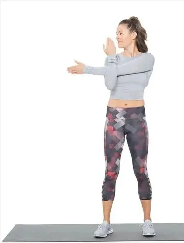 站立或坐着,将双手抓住身体前方,手肘弯曲,右手手肘抓住左手手腕,这时左手向上伸直,右手向下拉,感觉到左肩被拉伸,保持20秒,然后换手。